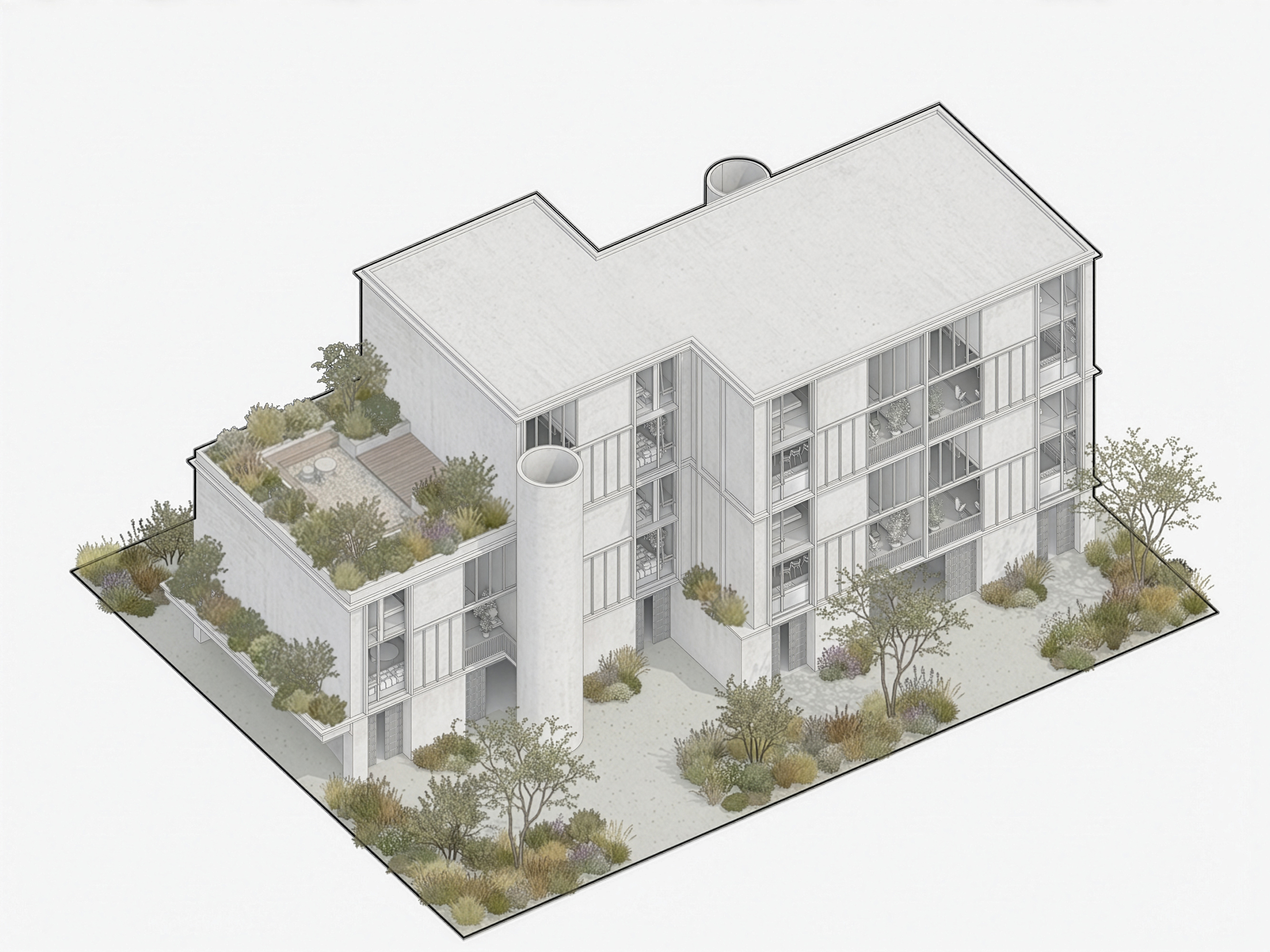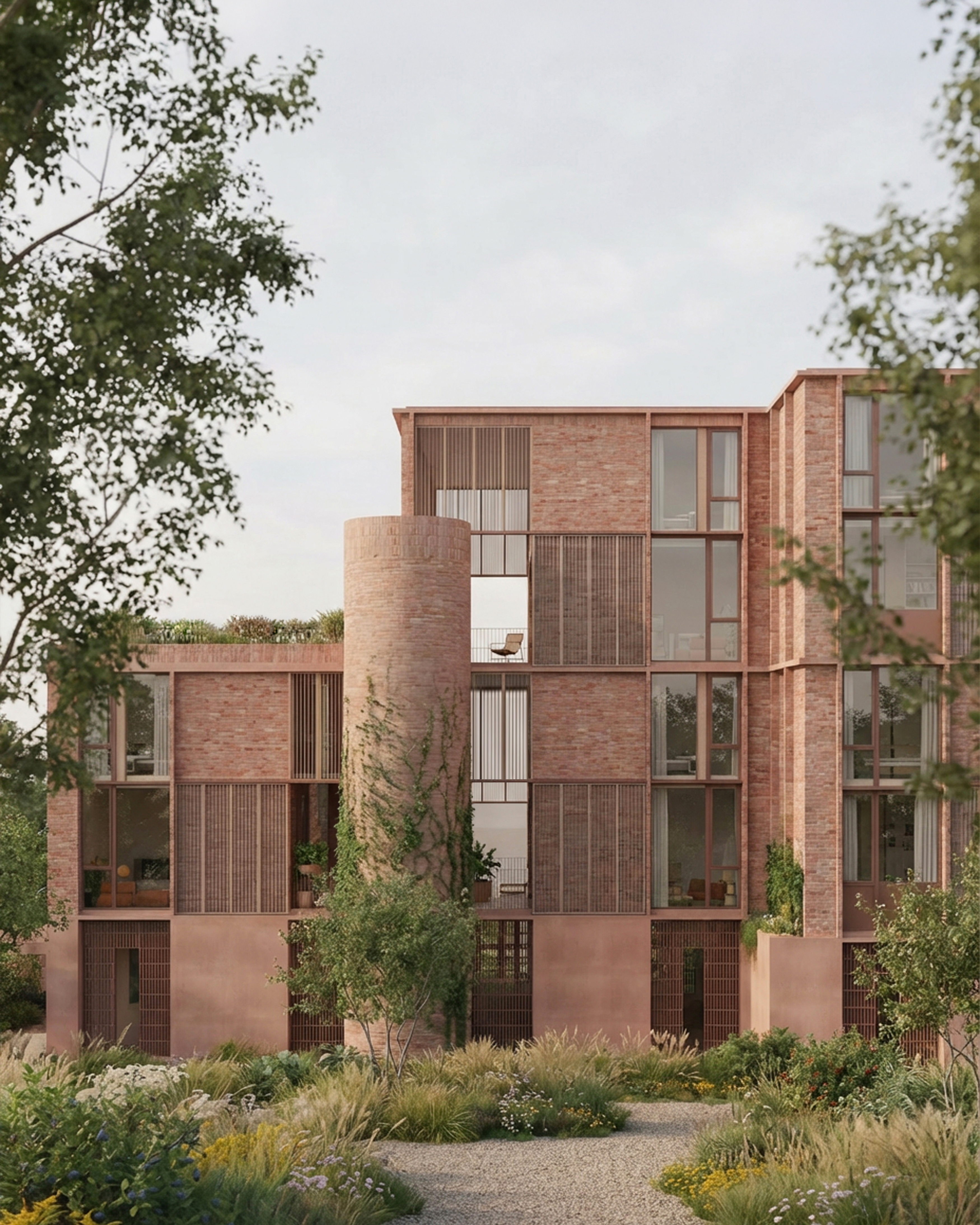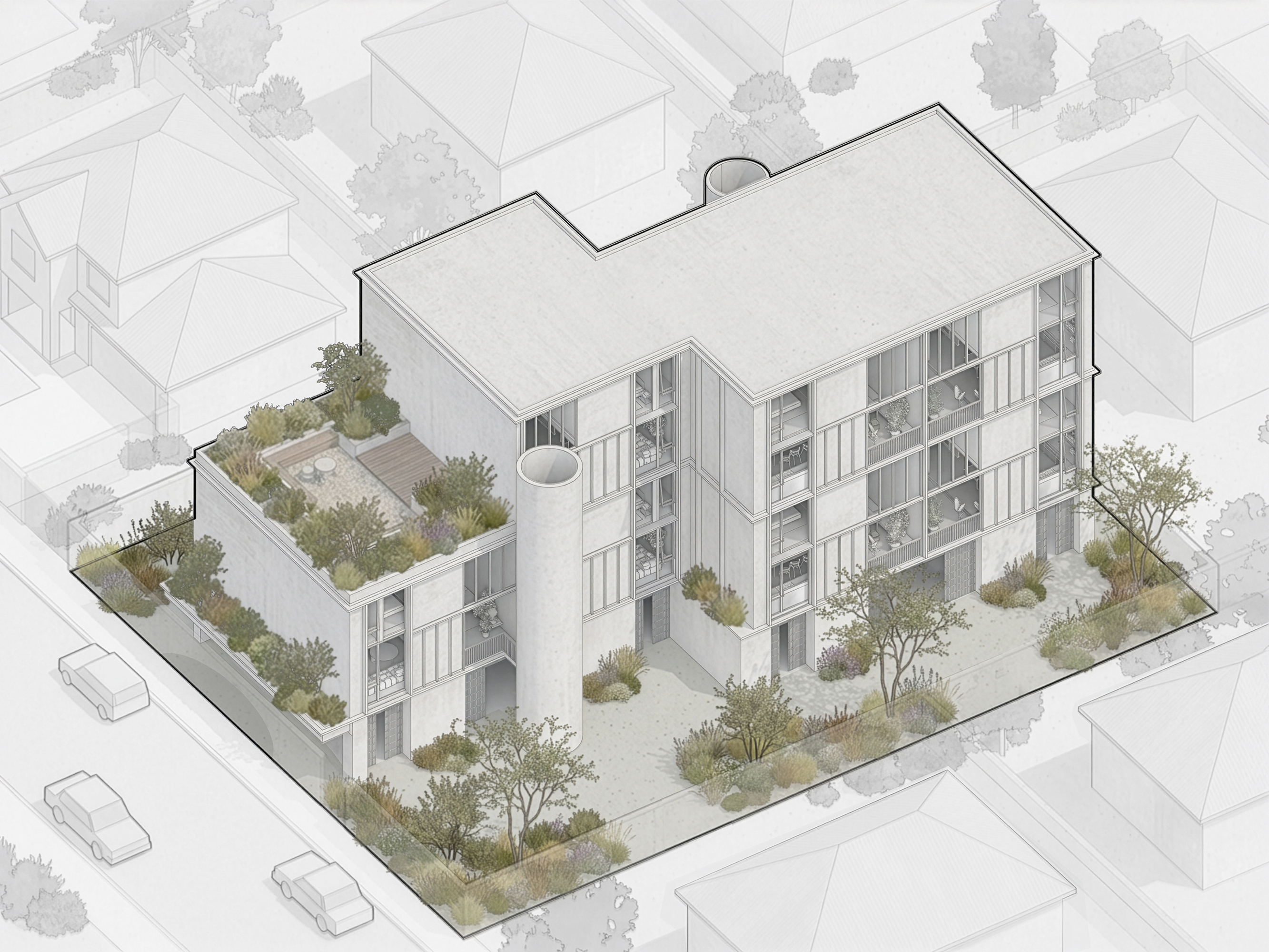 The gardens become an extension of each apartment. Parking is neatly tucked under the building, with the circular stair structures placed intentionally in the gardens to encourage use. The building is shaped to create space for gardens which bring light and air deep into the site while softening the space between the block and its neighbours. The shared landscape reinforces the project’s social intent, encouraging casual encounters whilst the stair cores maintain a clear sense of retreat into each apartment.