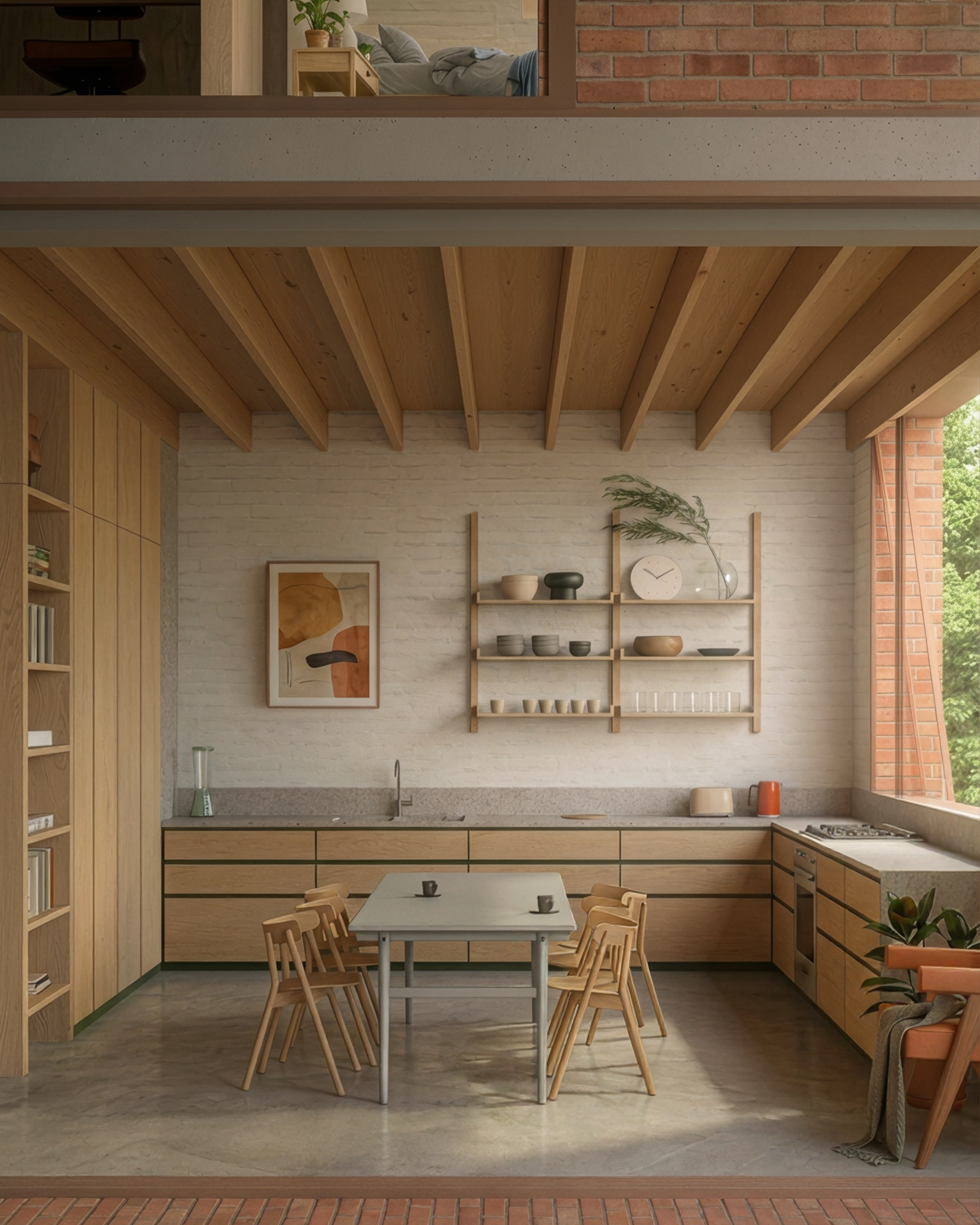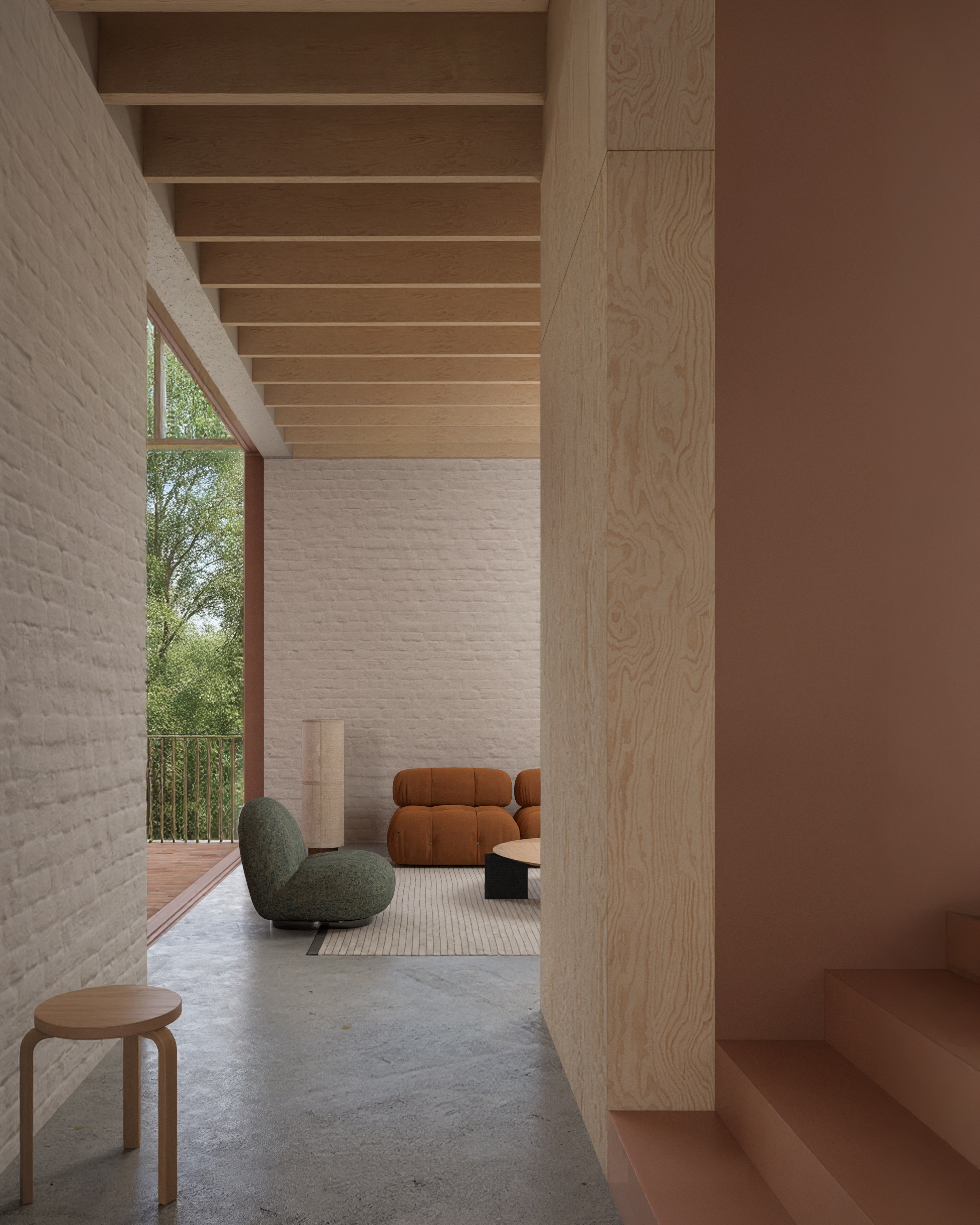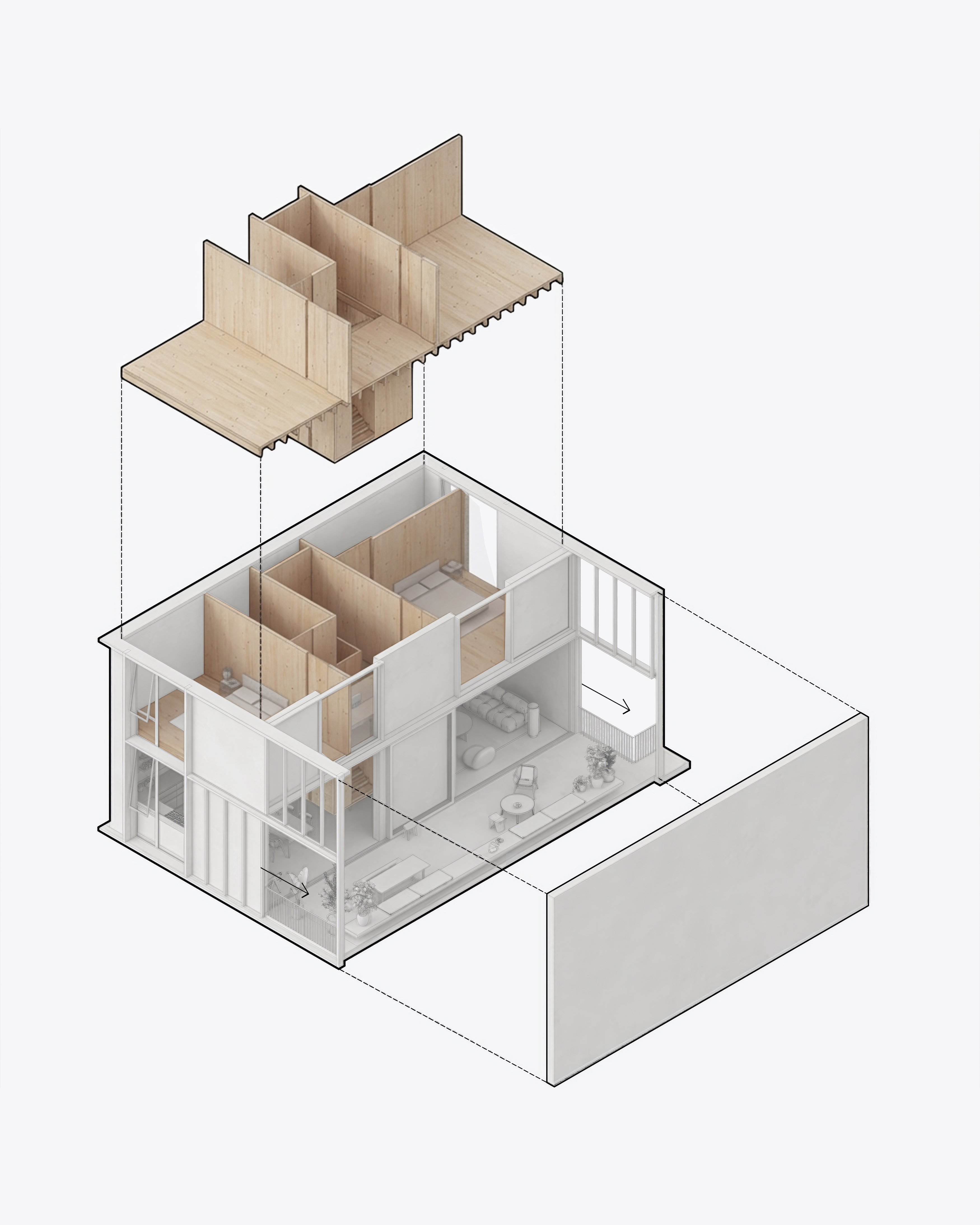 The layout already allows for different configurations with just a few subtle moves — you can choose two large bedrooms, one large and two small bedrooms, or a large bedroom with a study and a smaller room. The apartment also includes a shared workspace at the stair landing on the upper level, comfortably seating two people. In addition, the internal double-volume space allows the possibilty to add on new rooms into the volume.